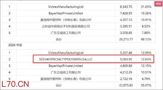 从客户结构看,一方面,公司对大客户依赖较大。2023-2025年,标的公司前五大客户收入占主营业务收入比重分别为78.11%、55.07%和68.12%,占比较高。2023年、2024年,可比同行新瀚新材前五大客户收入占主营业务收入的比例分别为59.34%、39.04%。另一方面,公司大客户稳定性也有待观察,24年标的公司第二大客户为“SOLVAYSPECIALTYPOLYMERSUSA,LLC”,而2025年该客户不在公司前五大客户名单之中。在大客户依赖较大的情况下,公司大客户出现如此波动,未来相关业绩可持续性又如何保障?