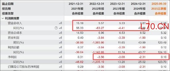 公告资料显示,2022年至2025年,兴福新材的营业收入分别为7.77亿元、6.09亿元、4.01亿元和3.86亿元,呈现出持续下滑态势。在净利润方面,兴福新材的表现更是犹如“过山车”,同期归母净利润分别为1.01亿元、1.36亿元、-73.67万元和1005.96万元,净利润极其波动。