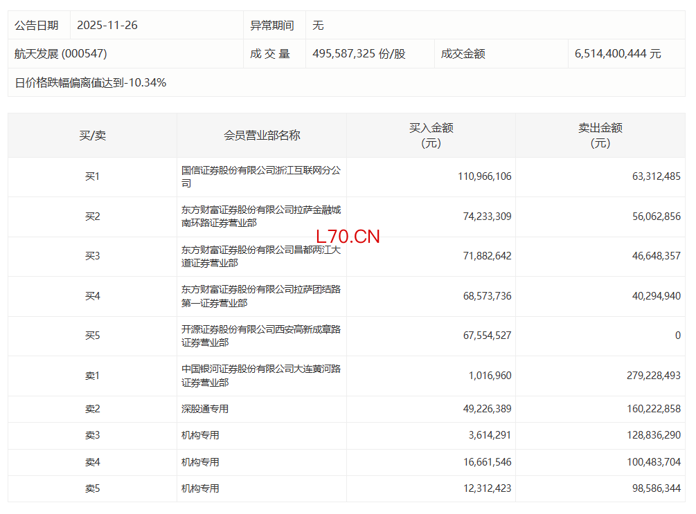 航天发展今日跌10.00% 陈小群席位净卖出2.78亿元