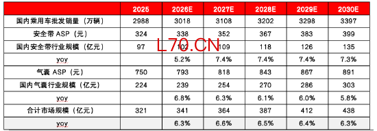 我们预计:2030年国内安全带&气囊的市场规模约为438亿元,2025-2030年CAGR约为6.4%,其中安全带规模为135亿元,气囊规模为303亿元。具体假设如下: