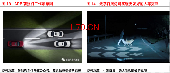 具体分技术路径看:1)ADB大灯可以控制每个LED灯珠的点亮或熄灭,从而实现分区照明,避免对来车产生炫光。2)数字大灯可以实现ADB的所有功能,并且由于其像素为万级甚至百万级(远超ADB的百级以下),因此精度更高;并且数字大灯可以实现更友好的人车&车车交互,例如在视线盲区投射交互光毯提醒对方有车辆、在没有斑马线的路段投射斑马线等。