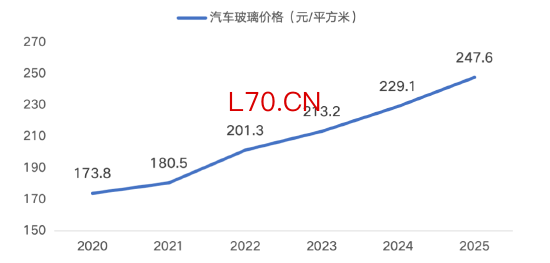 汽车玻璃产品持续升级,带动玻璃均价不断向上提升。全景天幕、调光玻璃、镀膜玻璃、HUD抬头显示玻璃高端品类玻璃的价格是普通玻璃的2-3倍,并且更大的加工难度带来了更大的溢价空间。近年来随着这类高附加值产品占比持续提升,汽车玻璃均价不断向上。我们以行业龙头福耀玻璃为例,2020年-2025年其汽车玻璃产品均价从173.8元/平方米提升至247.6元/平方米,期间累计涨幅42.4%,复合增速约7.3%。