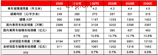 2)玻璃ASP:燃油车单车玻璃使用量约为3.5-4平方米,新能源车单车使用使用量约为4.5-5.5平方米,我们假设2025年单车玻璃使用量为4平方米,2025 -2030年提升0.1平米;玻璃均价及增幅参考福耀玻璃,假设2025-2030年每年提升5%;