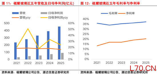 营收稳步增长,盈利能力持续向上。2025年,公司实现营收457.9亿元,同比增长16.7%,实现归母净利润93.1亿元,同比增长24.2%,持续高增长,主要受益于高度全球化,以及高附加值产品渗透率的持续提升。2025年,公司实现综合毛利率37.3%,同比增加1 pct,主要由于浮法自供带来的成本优势、高附加值产品占比提升;实现净利率20.4%,同比增加1.2 pct,费用控制能力依旧优秀。