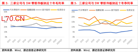 优质赛道通常具备更强的盈利能力与风险抵御能力。本文重点梳理汽车零部件领域的优质赛道,选取汽车玻璃、车灯、气囊&方向盘、座椅四大细分领域。上述细分领域均属于汽车安全件,具备强监管、高认证门槛、高客户壁垒等特征,行业参与者较少且以外资为主,对整车企业具备较强的议价能力。本文对比上述赛道代表性公司(玻璃:福耀玻璃;车灯:星宇股份;气囊&方向盘:松原股份;乘用车座椅领域因国内企业起步较晚、规模偏小未纳入对比)与申万零部件板块近十年的毛利率及净利率水平,我们发现: