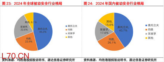 行业准入壁垒高,呈寡头垄断格局。被动安全系统与行车安全息息相关,具备高技术壁垒、严苛资质壁垒、稳定客户壁垒,行业准入壁垒极高。2024年,全球与国内的被动安全(安全带+气囊+方向盘)行业均主要由奥托立夫、均胜和采埃孚垄断,海外CR3超过90%,国内CR3超85%,行业集中度突出。