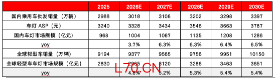 4)全球市场:2025年全球轻型车销量为9194万辆,我们预计2026-2030维持2%增速;海外新能源车渗透率偏低,车灯ASP取国内的95%。