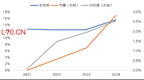 被动安全配置持续升级。汽车安全带与气囊属于被动安全系统的核心部件,可以在事故发生后保护驾乘人员。近年来,随着整车厂与消费者对驾乘安全重视程度不断提升,叠加自主品牌产品力持续向上,行业呈现两大趋势: