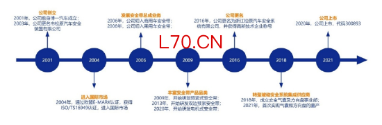 松原安全是国内唯一一家被动安全领域自主品牌的上市公司。公司前身成立于2001年,主营业务是安全带的上游零部件;2006年,公司从上游零部件延伸至安全带总成,切入商用车业务,主要客户为宇通、福田、东风柳汽、五菱宝骏等;2008年,公司切入乘用车业务,率先进入奇瑞;2018年,公司加速进入吉利、长城、奇瑞捷途等主流自主品牌,进入高速成长期;2021年,公司实现气囊与方向盘量产,正式转型被动安全系统集成供应商。