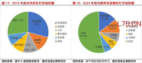 星宇股份是国内车灯龙头,并且市占率有望持续提升。2018年国内车灯市场主要由华域(原上海小糸)和外资垄断,星宇股份市场份额为10%、位列行业第四。近年来星宇不断加强技术研发、并积极拓展头部新能源客户,大灯市占率持续提升,2024年国内乘用车前装市场份额提升至14.5%、位列行业第一。此外,星宇的ADB、DLP智能大灯也在国内率先实现了大规模量产,2024年国内智能车灯市场份额高达70.2%。展望未来,我们认为随着车灯产品升级以及新能源车新品研发频率的提高,技术研发实力强、响应速度快的民营车灯厂如星宇股份,市场份额还将持续提升。