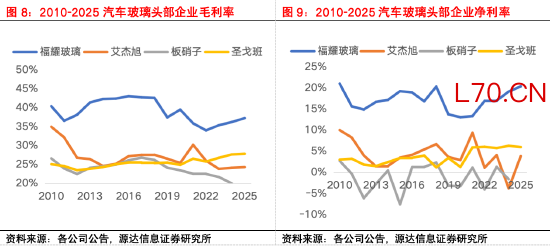 福耀玻璃专注汽车玻璃赛道,市占率有望持续提升。福耀玻璃近年来持续加大资本支出,聚焦高附加值玻璃新品研发,以及海外产能扩建,营收增速大幅跑赢竞争对手。此外福耀玻璃高度专注汽车玻璃,2025年汽车玻璃业务占比约91.5%,艾杰旭和圣戈班为多元化材料集团,玻璃占比分别长期维持在20%-30%和约10%,板硝子玻璃业务占比约为50%。福耀玻璃通过高度聚焦与高附加值策略,已实现长期稳定盈利,2010-2025年毛利率维持在35%以上,近3年净利率稳定在16%-19%,远高于竞争对手。