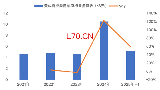天成自控的传统业务是工程机械座椅和商用车座椅,历经多年耕耘,逐步成长为国内工程机械座椅龙头。2015年,公司开始进军乘用车座椅市场,目前客户覆盖上汽乘用车、上汽大通、北汽新能源、东风乘用车、奇瑞、江淮、比亚迪、蔚来等。2025年H1,公司乘用车座椅业务实现营收5.21亿元,同比增长约60%。