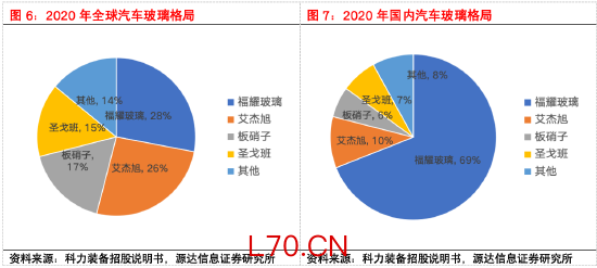 行业壁垒高,呈寡头垄断格局。汽车玻璃具备重资产、重人力、长工序等行业特性,行业壁垒高。汽车玻璃行业格局集中度高,2020年全球CR4超过85%,其中福耀玻璃以28%位列首位,第2-4名为艾杰旭(原旭硝子,26%)、板硝子(17%)、圣戈班(15%);国内CR4超过90%,福耀玻璃优势更为明显,市占率接近70%,远超艾杰旭、板硝子、圣戈班等竞争对手。